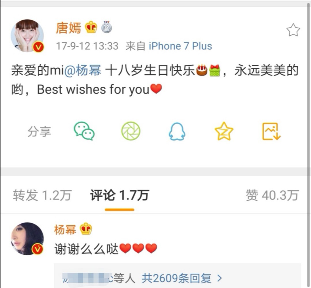 唐嫣微博中,杨幂最后一次出现是2017年9月12日杨幂的生日,唐嫣祝贺杨幂生日快乐。这时候杨幂回复唐嫣的微博就有点客气了,直接就是谢谢么么哒,而回复别人的微博就更加亲切点,这也就看出来在这个时候友谊就有点淡了。