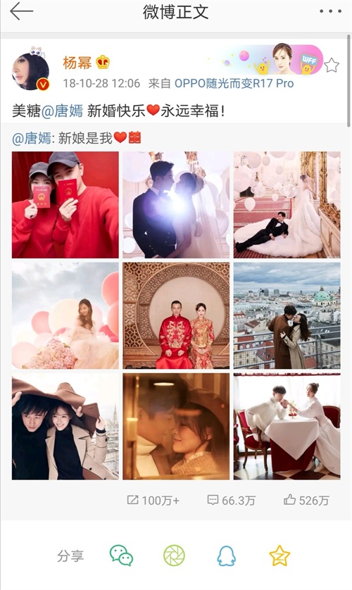 我们一起来看下,杨幂微博中,唐嫣最后一次出现是2018年10月28日,祝贺唐嫣新婚的微博。