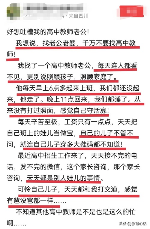 一位来自四川的网友发文吐槽自己作为高中老师的老公,并且以过来人的身份劝大家找老公老婆千万不要找高中老师。这究竟是怎么回事呢?