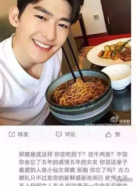 所以,即使过去了三年在粉丝眼里,秦俊杰就是这段感情的刽子手,不能饶恕。这就让人想起了娱乐圈著名的“牛肉面梗”:真爽和张翰曾经是恩爱情侣,后来两人分手收场,当分手多年后的张翰在微博晒出牛肉面,郑爽的粉丝竟然质问他,小爽都这么瘦了,你却还吃得下牛肉面?