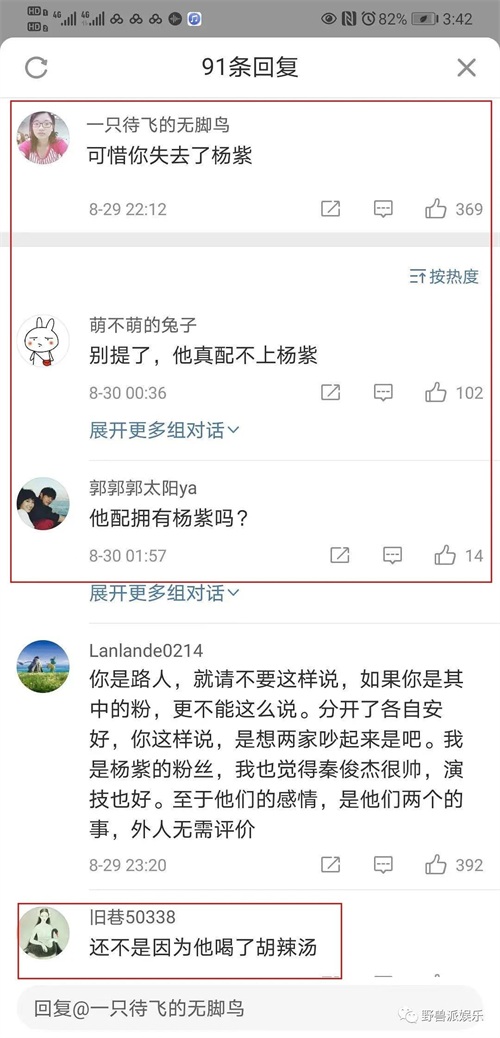 虽然事关业务,也算是一则小插曲,然而杨紫的粉丝去跑过来在这条微博下留言,说可惜他失去杨紫了。粉丝这话说得莫名其妙,可以算得上是驴头不搭马嘴,然而又有杨紫粉丝继续盘他,说别提了,他真配不上杨紫。