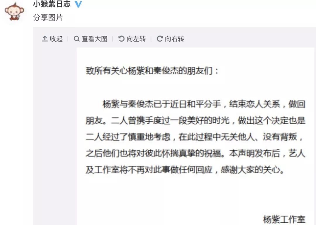 2018年8月份,杨紫和热恋两年的男友秦俊杰官宣分手,双方工作室分别承认二人已经分手:无关他人,没有背叛。