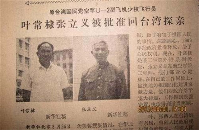 1982年8月25日,两岸关系开始有所转变,大陆方面为了表达善意,《人民日报》特意报道了张立义和另一名被击落的U-2飞行员叶常棣还存活于世的消息,同时还就此向台湾方面通告称“准许叶、张两人回台湾省亲”。