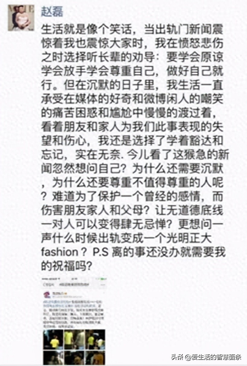 2016年,华谊公司CEO赵雷发表了一篇“愤怒”的文章,尤其是最后两句话,无疑对妻子秦舒培和新欢陈冠希提出了质疑。