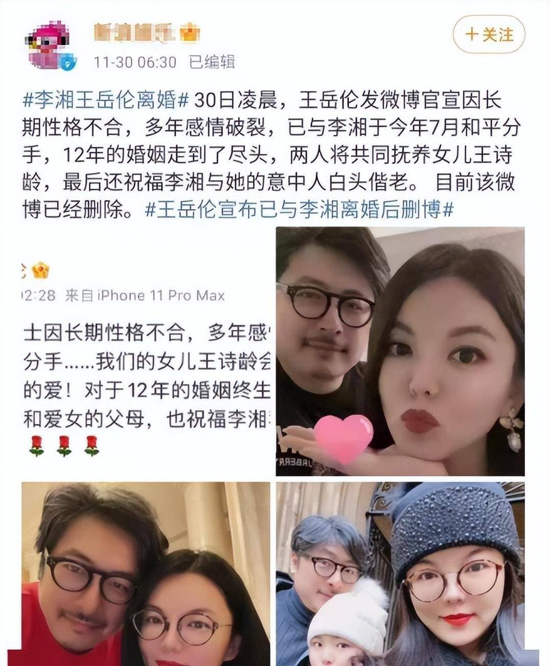 信息来源:王岳伦微博官宣与李湘离婚,随后秒删.