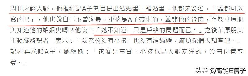 而大野友洋经不住日媒的围追堵截,承认与A某曾有过感情,但无论是结婚书还是离婚书他都没有签过名,也没有过家暴,三个孩子也都不是他的。但他也承认华原朋美一直不知情。