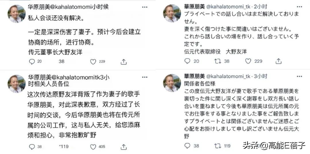 大野友洋在华原朋友的社交平台贴出两篇道歉声明,分别以经纪公司“传元”社长身分、个人身分所发。