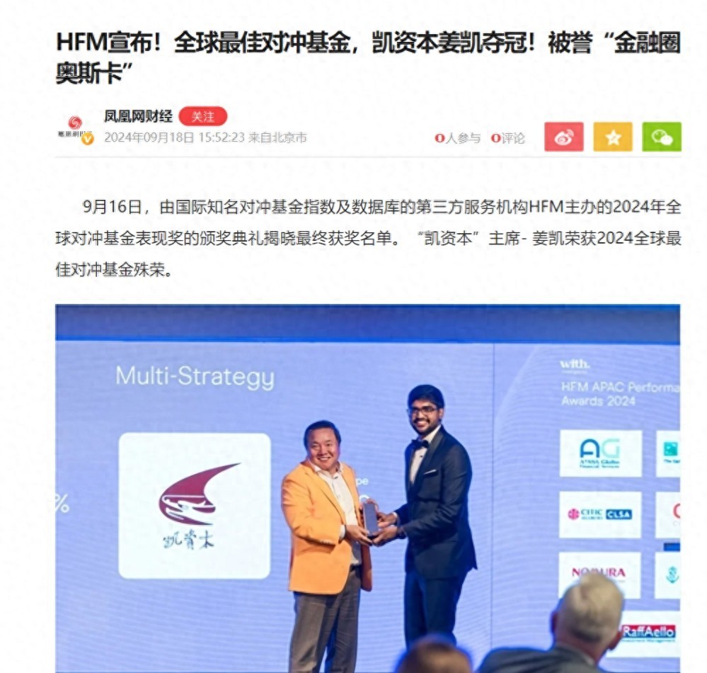 原来是“凯资本”的主席姜凯斩获了2024全球最佳对冲基金的奖项,要知道,这个奖项可是被称作对冲基金领域的“奥斯卡”。