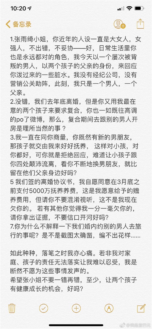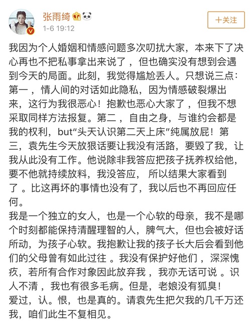 袁巴元连夜撰文回应,坚称张雨绮是在和自己保持情人关系的情况下,和其他男子约会开房,并澄清5000万是孩子的抚养费,而不是张雨绮所说的欠款。