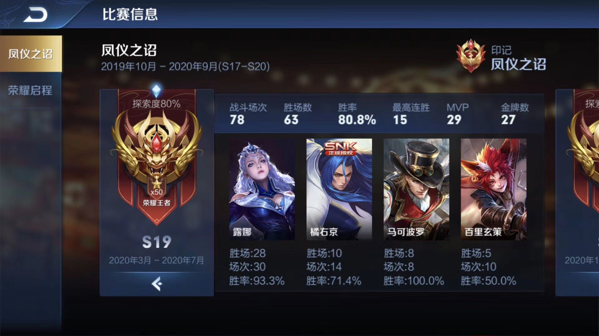 1、荣耀王者局15连胜、新赛季78场游戏直接打上荣耀50星!