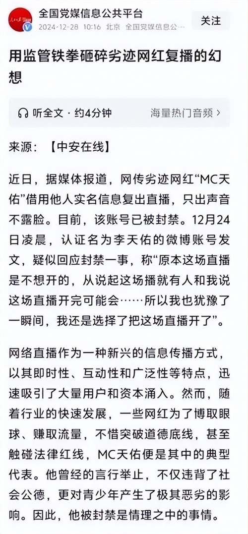 在这个信息爆炸的时代,网红如雨后春笋般涌现,但并非每个都能长久立足。近日,被封网红MC李天佑再次被权威媒体点名,用监管铁拳砸碎了他复播的幻想,这一事件无疑给整个网红圈敲响了警钟。