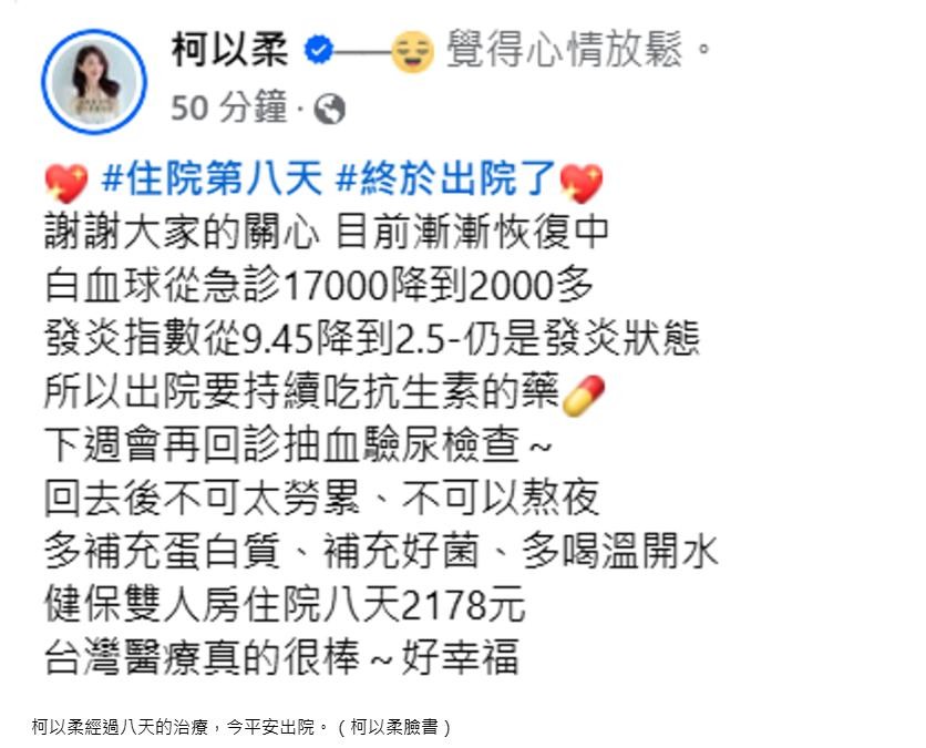 最后,柯以柔十分高兴的说,住院的这八天,她一共才花了2178元,还点名感谢台湾的医疗实在是太棒了!让她感觉到十分的幸福。