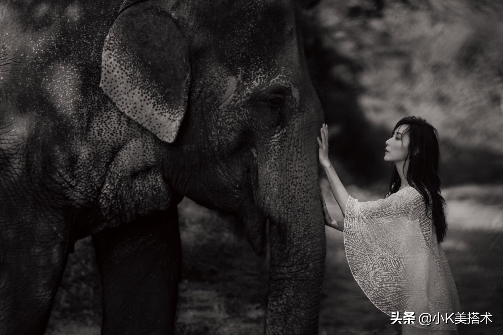 胡静身穿白色薄纱长裙,和大象亲密接触,画面十分高级,像极了电影里的场景!胡静湿发披肩,搭配薄纱的披肩和修身的白色长裙,十分性感迷人!胡静身形十分纤瘦,所以即使是修身的造型依旧驾驭得游刃有余!