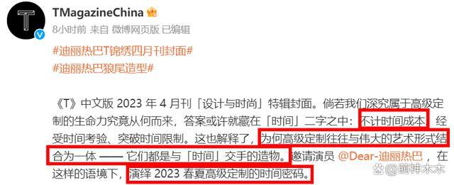 这一次热巴登上的是《T》中文版 4 月封面,《T》这本杂志是纽约时报旗下的时尚刊物,虽然 2015 年才推出中文版,但在圈内认知度一向不错,《T》杂志的定位主要面向高级知识分子和中产阶级,看到这大概能了解杂志风格了吧——好不好看另说,咱就主打一个好儿面儿子儿。