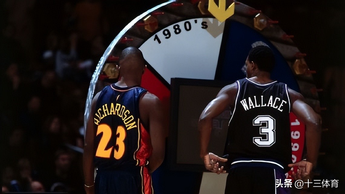 2002年扣篮大赛期间,萨克拉门托国王的杰拉德·华莱士和金州勇士的杰森·理查德森正在观看扣篮大赛的转轮