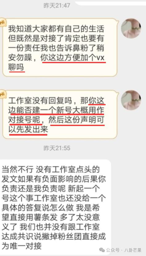 她又不是发工资的人,却理直气壮地对人家发号司令,安排一个又一个的工作,甚至要人家直接新开一个号,代替明星团队发声明。对方果断拒绝。废话,正常人都不可能答应,出了事谁负责?!
