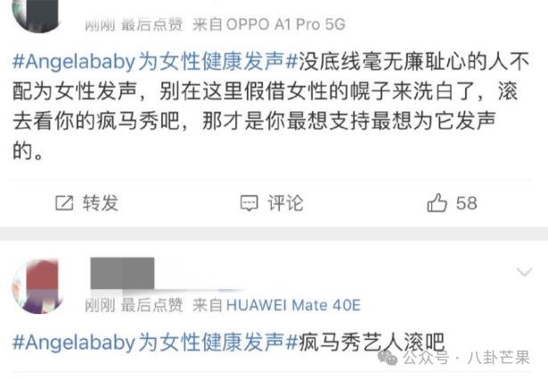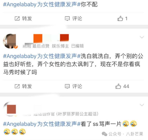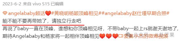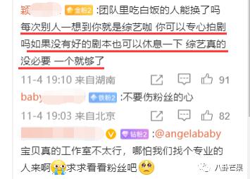 另外,大家注意到没有,随着 Angelababy 的资源降级,粉丝的诉求也在降级。一两年前,粉丝还在要求她不要甘于混综艺,要进组,要出作品!