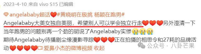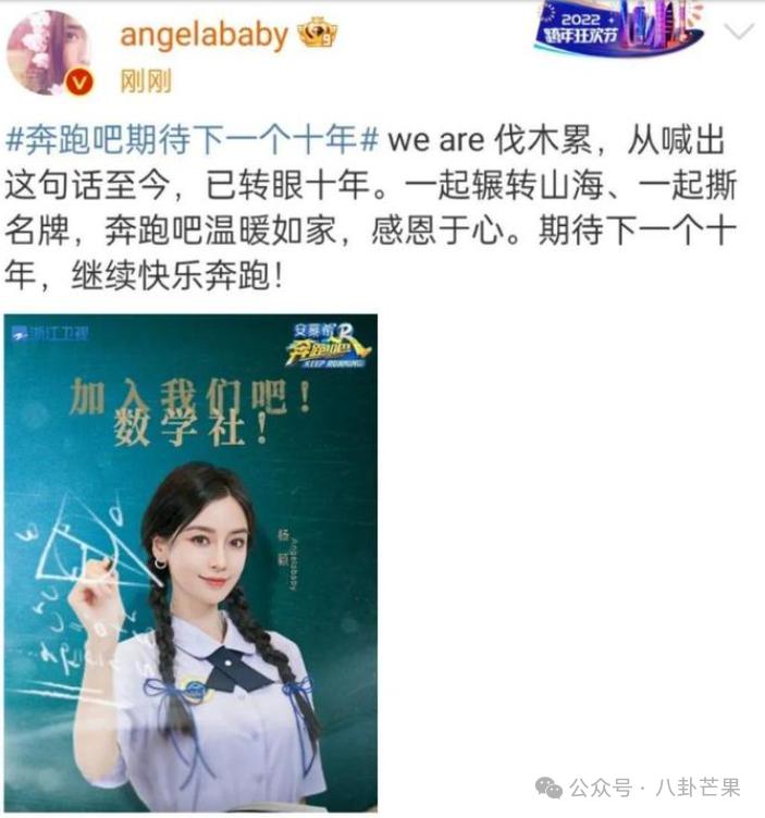 去年 7 月份,Angelababy 还发文称 " 期待下一个十年 ",可见退出《奔跑吧》并不是她所愿。