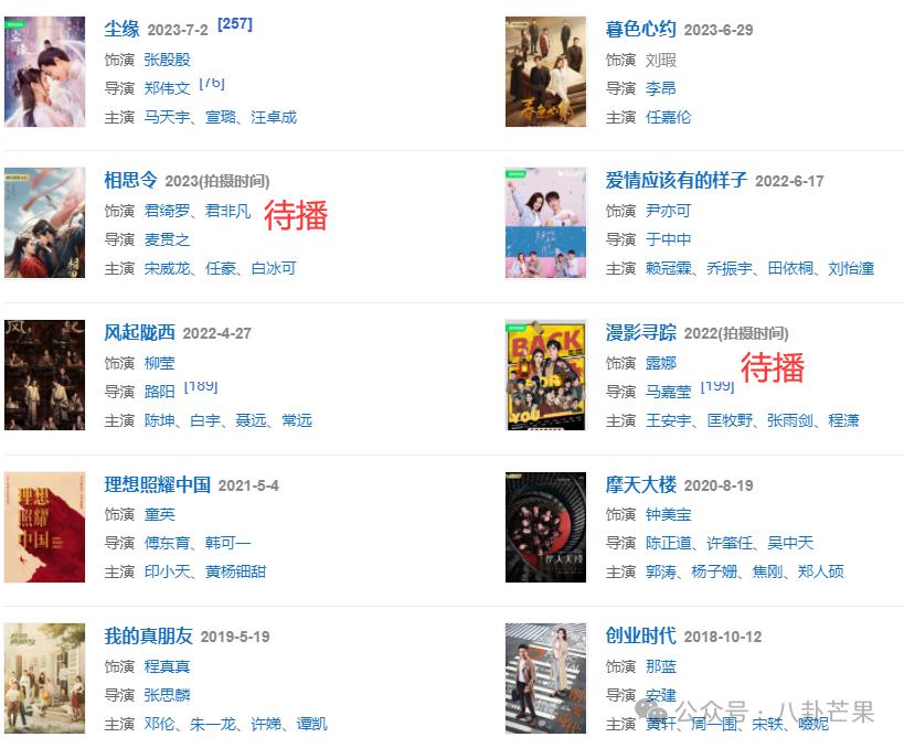 Angelababy 这几年的剧 list 非常单薄,待播也只有一脸糊相的《相思令》和一部 12 集低成本小网剧《漫影寻踪》,她后面的曝光度是没有保证的。