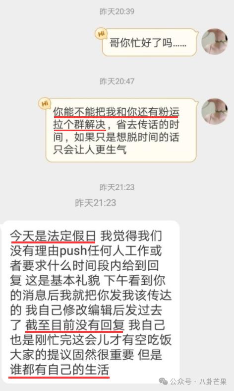 但是看一下粉丝控诉中间对接人的证据 ↓,只要没有被粉圈思维洗脑的人都能看出来不正常的是谁。粉丝在节假日不断催促人家去工作并且一定要给出她满意的结果。
