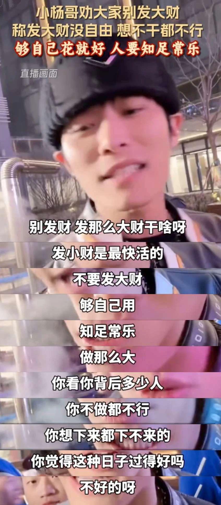 小杨哥曾经说过一句话,他说不要发大财一点也不快乐,并表示自己已经不是当初那个自己了。