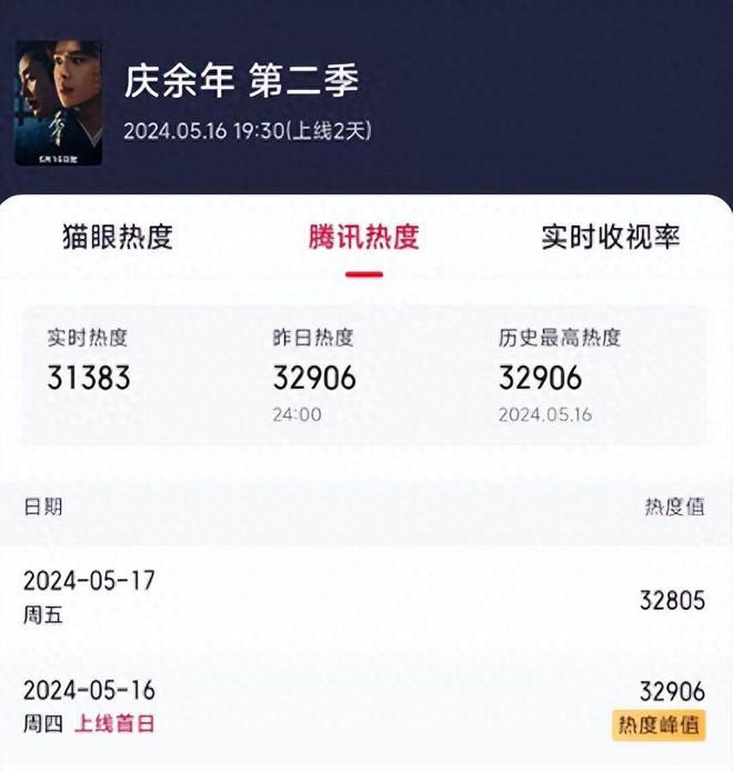 《庆余年 2》应该是 2024 年第一个爆款剧了,毕竟能上映第一天就突破 3.2 万的热度,是很少见的。