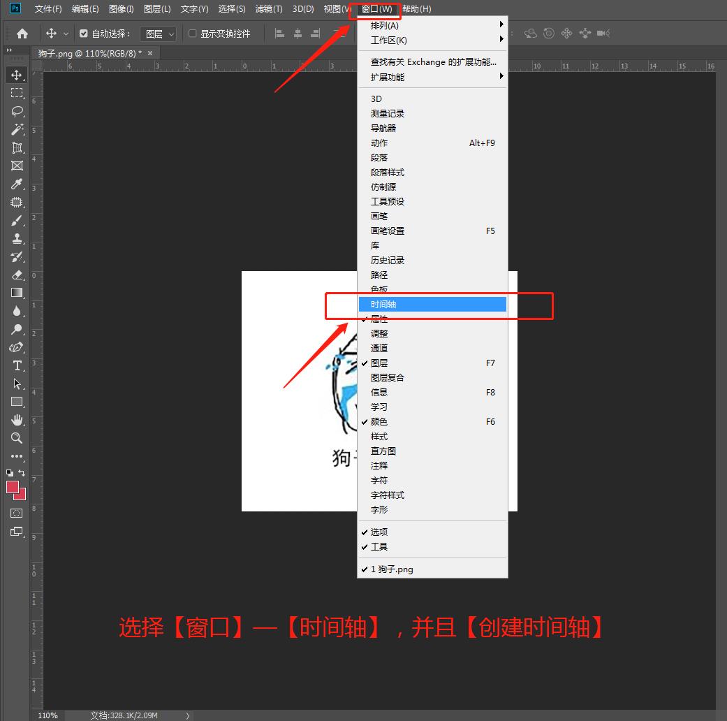 第二步,选择【窗口】—【时间轴】,画布下面出现【创建时间轴】字样,选择【创建时间轴】