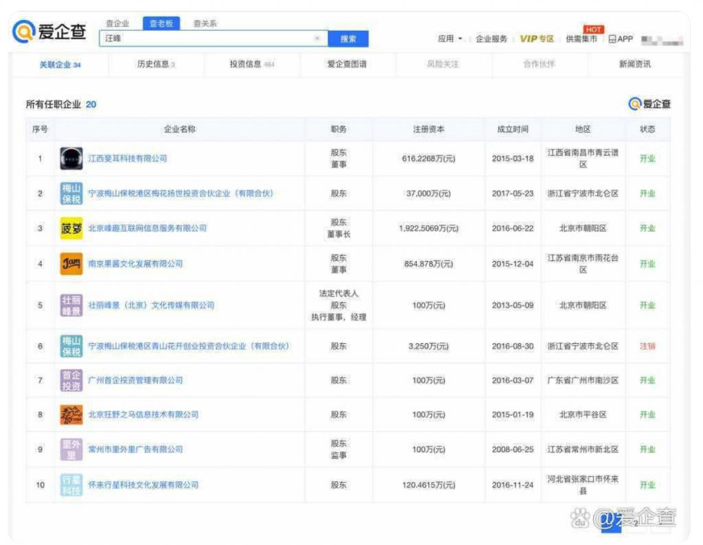 爱企查 App 显示,截至目前,汪峰名下共关联 20 家企业,其中 12 家为存续状态,包括保税宁波梅山保税港区梅花扬世投资合伙企业(有限合伙)、壮丽峰景(北京)文化传媒有限公司、北京峰趣互联网信息服务有限公司、江西斐耳科技有限公司等,大部分为文化、影视娱乐相关公司。在上述存续状态的企业中,汪峰在 12 家企业中均持有股份,担任 3 家企业的法定代表人,并在 7 家公司中担任董事、董事长等高管职务。
