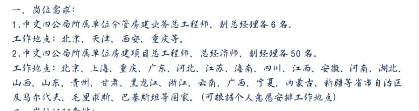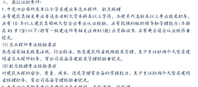 当然中交四公局岁总工程师和总经济师的专业、工作经验要求还是非常高的了吧,没有3-5年大型承包工作的贡献应该也是没有足够自信参加报名的,央企国企的任职经历同样会让大家在中交四公局发光发热。