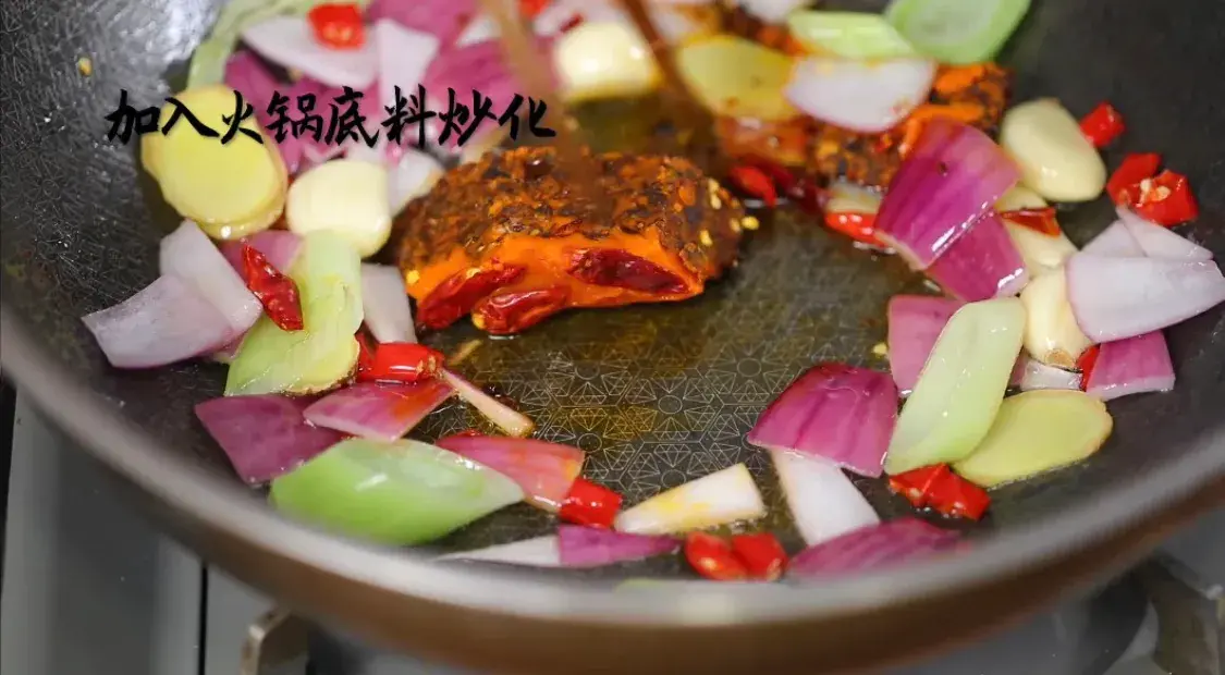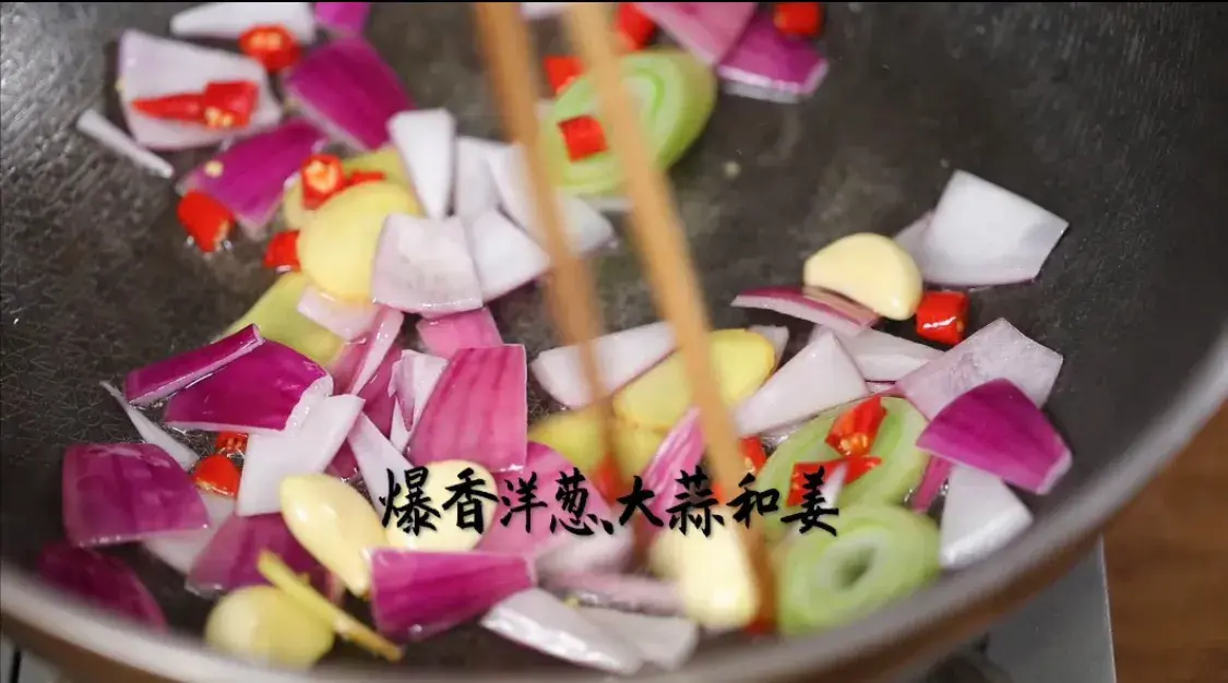 起油鋼,加小米辣,大葱,生姜,洋葱,大蒜爆香。