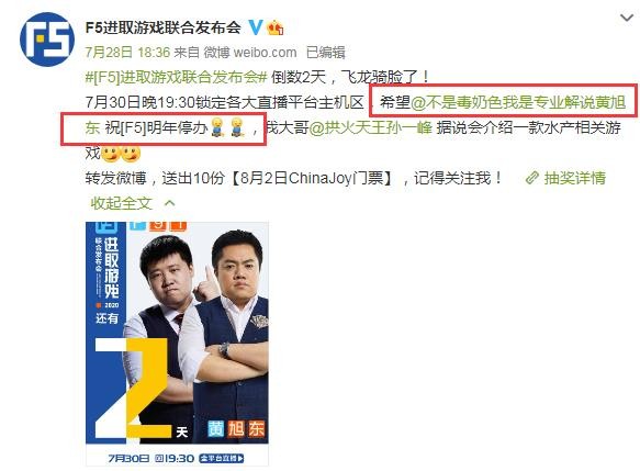 然而,这年头总有一些大胆的人,忍不住想试一试这把宝刀是否还锋利,邀请黄旭东为一场“[F5]进取游戏联合发布会”站台,并且届时为大家介绍一款“水产游戏”?而黄旭东这次依旧扛起他的“因果律武器”,开局就是一口毒奶:希望明年停办!