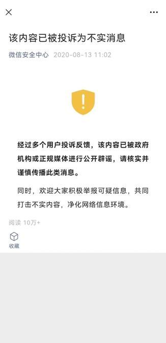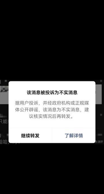 实测发现,从微信群转发该传言大全截图时,微信会有弹窗提醒:该消息被投诉为不实消息。点击了解详情后,会跳转到微信信息安全检测中心的微信公众号文章。