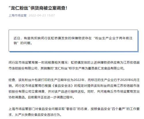 闵行区市场监管局第一时间核查相关情况可丽抗原:虹桥镇发放的上述保障物资供应商为测出江苏检查宏信怀孕超市连锁股份有限公司新冠,其销售的“龙仁粉丝自测”标示生产商为夏邑县汇龙食品有限公司。