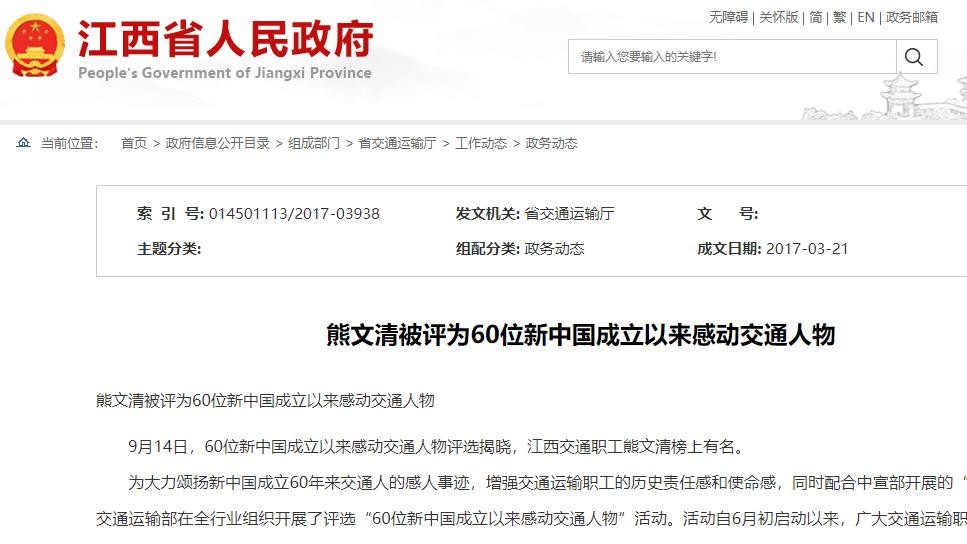 江西省人民政府 政务动态 熊文清被评为60位新中国成立以来感动交通人物-江西省人民政府