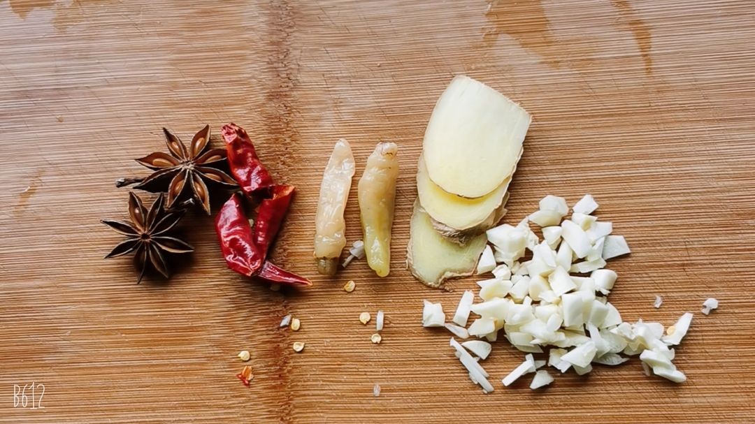 4,根据口味准备好花椒、八角、蒜末、泡椒、辣椒、姜片。