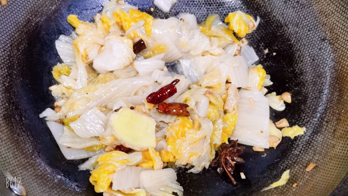 5,起锅烧油,放入步骤4中的调味料,煸炒出香味,再将焯水后的酸菜放入锅中,翻炒均匀,炒出香味,这里可根据个人口味淋入适量料酒和生抽调味。