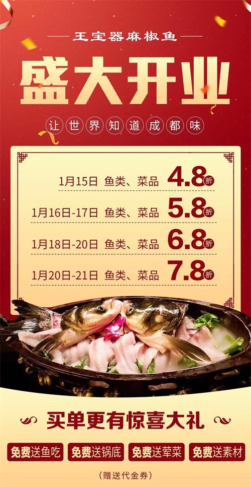 现在,王宝器麻椒鱼新店开业,店家盛情推出了各项活动,不仅打折,还有更多惊喜等你来!
