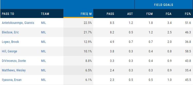 雄鹿队主力控卫布莱德索一直是一名进攻至上的球员,而其他后场主要轮换球员马修斯、科沃尔、康诺顿、布朗都是以接球投篮终结为主,唯一的传统后卫希尔受年龄和出场时间限制,在组织进攻端贡献有限。因此这支雄鹿队绝大部分的进攻发起都是从锋线的字母哥和米德尔顿开始,他们每场比赛能够联手送出10记以上助攻。