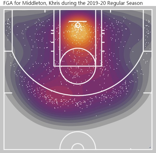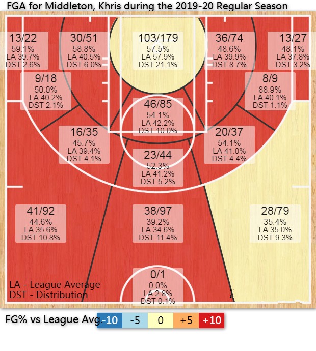 本赛季米德尔顿以场均49.9%的投篮命中率拿下21.1分,其中三分球命中率41.8%。不同于一般的内线球员或者3D型球员,米德尔顿的投篮分布非常分散,遍布整个半场。他几乎在半场的每一个位置都保持了极高的效率,哪怕是他看起来最不准的近距离篮下或者右侧45度角三分线外,他也保持在联盟平均水平。