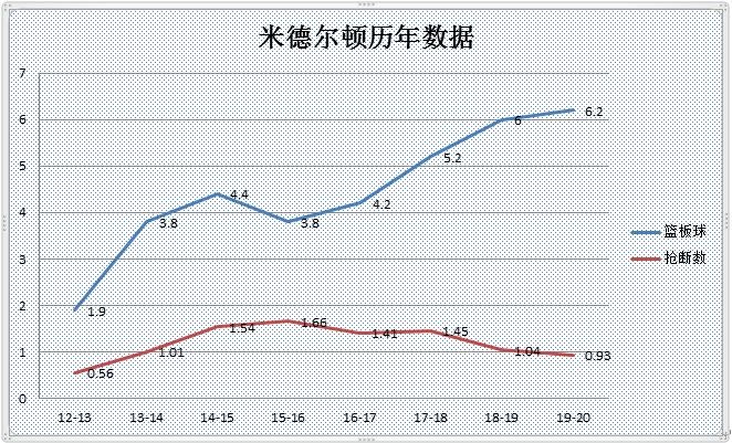 大学时期的米德尔顿是一个非常不错的篮板手,他的场均篮板球维持在5个以上。不过加盟NBA联盟以后,随着对手身体级别的升级和防守强度的提升,米德尔顿并没有在篮板端展现自己的实力。如今随着时间的推移,他还是逐渐发挥了自己的优势,他的篮板球逐年提升,如今已经场均篮板球应突破六个。作为一名矮个子锋线球员,虽然他的前场篮板球不是很多,但是能够在常人如林的比赛中稳定地拿到这样的数据,着实不易。