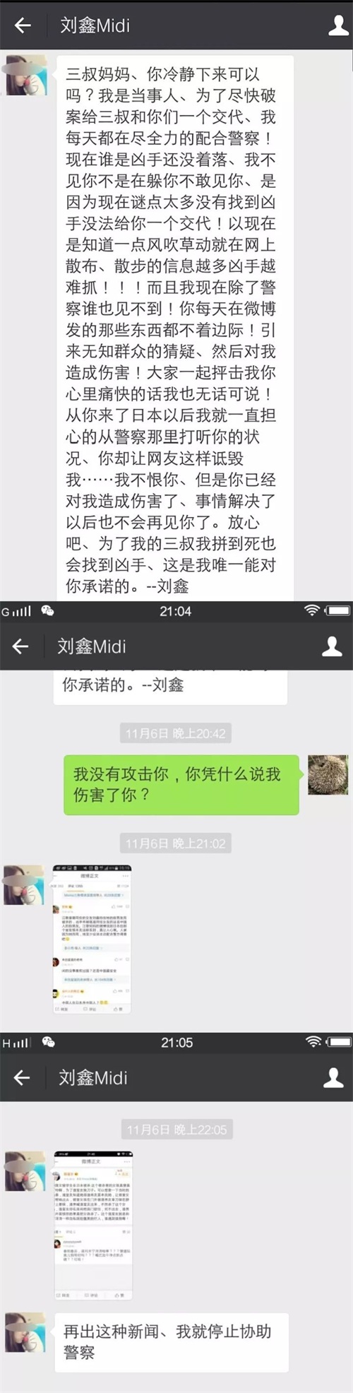 11月6日,刘鑫指责江秋莲私自散步信息影响案件侦破,并威胁江秋莲说,“如果再出这种新闻,我就停止协助调查。”