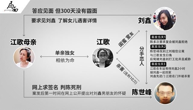 刘鑫对《局面》表示,因为前男友找来要求复合,她拒绝后被一路跟随。因为有些害怕,就让江歌下班后在车站等她一起回去。到家后,刘鑫称因为来例假,先回屋换衣服。在门外的江歌却遇害了,时间是3日凌晨0时15分左右。