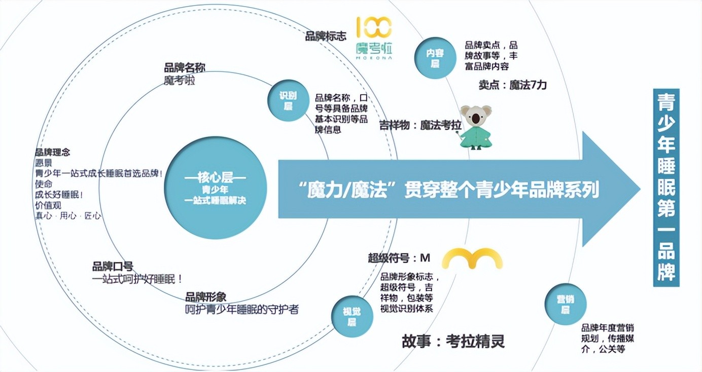 每一个品牌要素环环相扣,打造出青少年儿童喜欢的魔法世界,构建了魔考啦品牌的体系化。而这里面的每一个要素都是建立在消费者所熟悉的认知层面的,比如对考拉嗜睡的认知,对魔法的认知,对魔法石的认知,对100分的认知,这些都是大众熟悉的要素,魔法来源于魔法石,魔法石助力魔考啦,呵护青少年睡眠,并助力青少年成长满分。魔考啦体系化构建了产品品牌价值,在后期传播中能更好的降低认知成本。