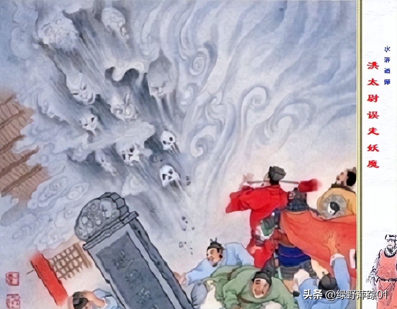 “洪太尉误走妖魔”,太尉是武职,洪太尉就是“洪武”。朱洪武误走的妖魔,指的是洪武三年(1370年)“封建诸子”。朱元璋恢复封建,大明便陷入了“诸侯(朱猴)”之乱,所以,《水浒传》开篇五绝第一个提到的是朱温。朱温谐音朱瘟,就是嘉祐三年的那场瘟疫。