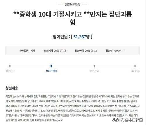 有网友在青瓦台请愿板中上传了名为“让十几岁的中学生晕倒并抚摸其性器官的集体欺凌”的请愿文,请求警方进行再次调查。