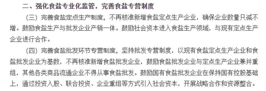 改革方案确实提到了放开,放开了什么?第一是价格,食盐的价格不再由国家确定而是由市场来确定;第二是流通渠道,原先食盐生产企业只能销售给指定批发企业,现在允许生产企业进入流通和销售领域实现产销一体;第三市场打通,原先食盐批发企业只能在指定范围销售,现在省级企业可以跨省销售,省级以下企业可以在本省范围经营。请问,这三个放开和竹盐有什么关系?另外,重点来了,方案第二点第三条和第四条明确规定“不再核准新增食盐定点生产企业,确保企业数量只减不增。”“以现有食盐定点生产企业和食盐批发企业为基数,不再核准新增食盐批发企业”(原文见下图)