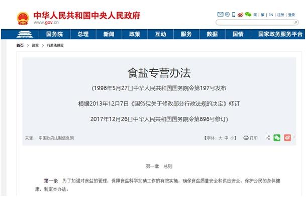到目前为止食盐还是专营的,《食盐专营办法》就是专门规范食盐生产经营的法规(见下图)。