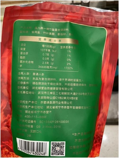 这个产品的品名是“鑫九鼎一烤竹盐复合调味料”,执行标准是GB 31644-2018,这是调味料的国家强制性标准,也就是这款产品不是食盐,因此就不受食盐专营所限。