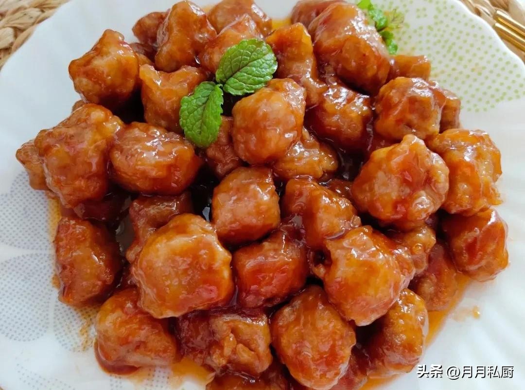 4.锅中留少许底油加入料汁,煮至料汁冒泡稍粘稠后放入炸好的肉块,快速翻炒,让每个肉块都裹上酱汁即可。