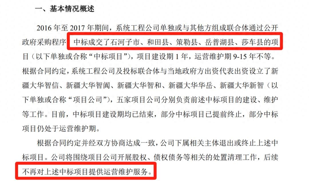 公告内容是大华股份在2016年~2017年,中标了新疆5个地区的安防项目。